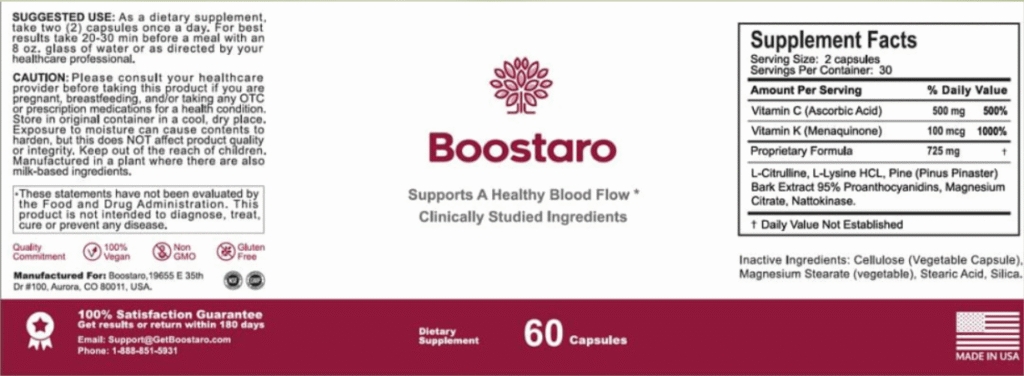 The secret lies in Boostaro’s seven powerful ingredients: L-Citrulline, Pine Bark Extract, Vitamin C, L-Lysine, Magnesium, Vitamin K2, and Nattokinase.
